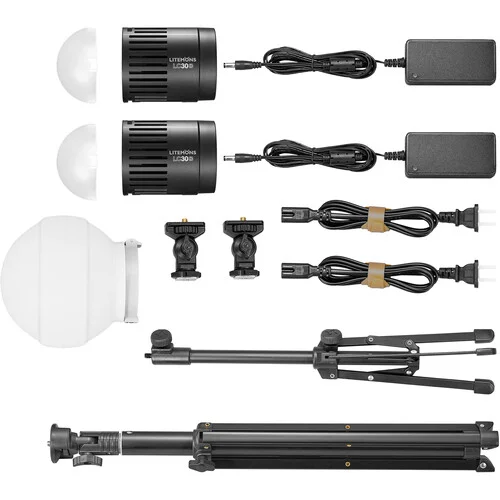 Lightweight and portable, the Litemons LC30D Tabletop LED Two-Light Kit from Godox is a versatile and efficient lighting solution for content creators, tabletop product shooters, vloggers, and more. An intuitive and budget-friendly LED lighting system, the LC30Ds make it easy to set up and illuminate your shooting area. The fixtures provide bright and dimmable lighting for small product photography and tabletop livestreaming, and the lights’ high CRI and TLCI ratings of 95 and 96 produce highly accurate color renditions and realistic skin tones. Also included in this kit are two small diffusers, a large diffusion dome, a desktop tripod, and a traditional tripod. Together, all these tools allow you to configure your lighting setup and camera placement for maximum creative effect.